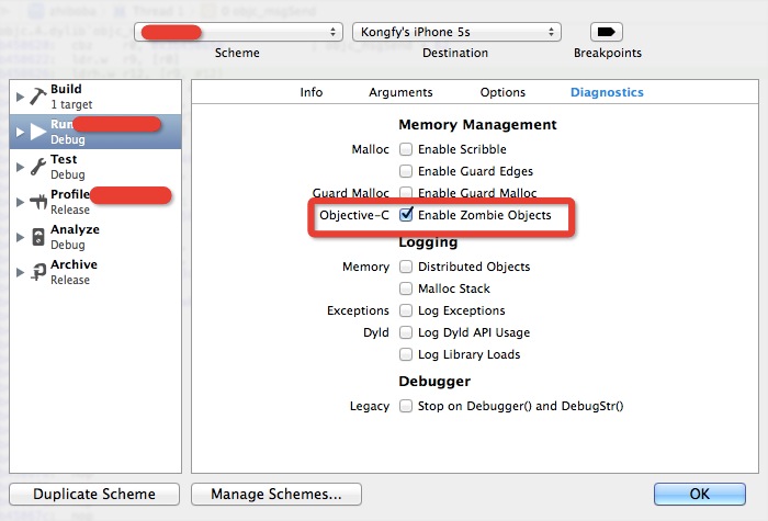 那么该怎么找到这个不存在的对象呢?很简单,使用Zombie Objects!Apple的命名还是很形象的,如果你在build时开启了这个选项,那么运行时释放的对象都不会被完全释放,而是留在内存中,就像Zombie一样~ 在”Product”-“Scheme”-“Edit Scheme”中打开Zombie Objects: