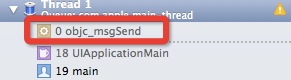 有进展!看来导致应用Crash的罪魁祸首就是这个objc_msgSend函数!这个函数是Objective-C中的runtime消息发送实现,我们所使用的 [MyClass function] 这样的“函数调用”在Objective-C中实际上都是在运行时由Objective-C使用消息传递来实现的,就像这样: objc_msgSend(MyClass, @selector(function)) 。也就是说我的问题是由于在运行时给一个不存在的对象发送了消息所以导致了Crash。