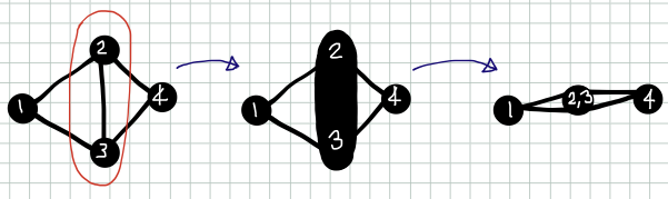 这样一次运算的复杂度为$O(m)$,我们可以看到,这样随机的过程返回的结果是不确定的,找到的割并不一定是最小的,事实上可以证明,一次运行找到最小割的概率最低为$1/{{n}\choose{2}}$,那么,将上述算法重复执行${{n}\choose{2}}\ln n$次,我们可以以低于的$1/n$的失败概率获得最小割,这就是Karger全局最小割算法的基本思想,时间复杂度为$O(n^2m\ln n)$。(算法的证明很有意思,偷懒不写了哈哈,可以在参考资料中查到)